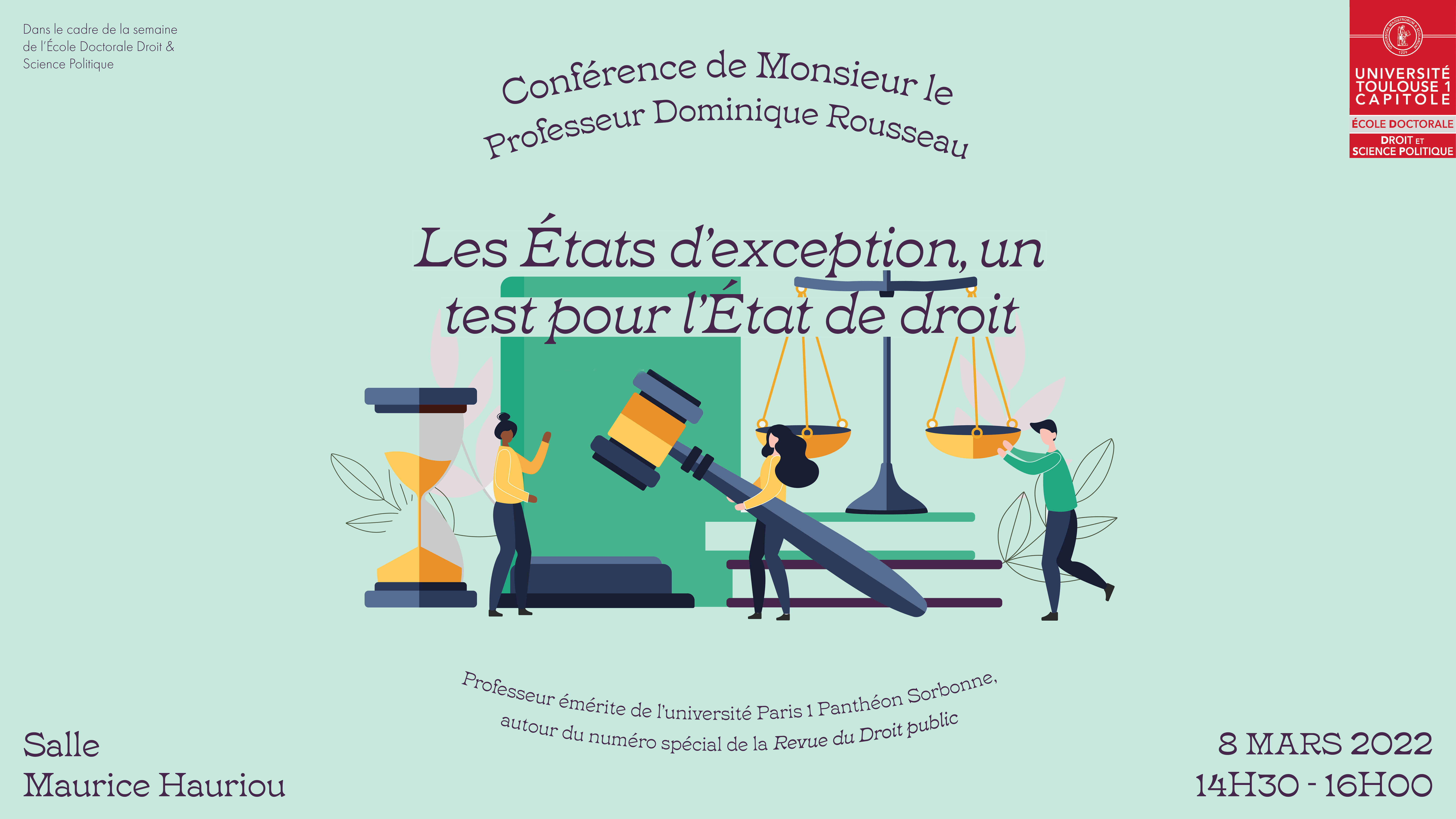 - Conférence donnée par Monsieur le Professeur Dominique Rousseau, Professeur émérite de l'université Paris 1 Panthéon Sorbonne, autour du numéro spécial de la Revue du Droit public : "Les États d'exception, un test pour l'État de droit", mardi 8 mars 2022 de 14h30 à 16h, salle Maurice Hauriou.