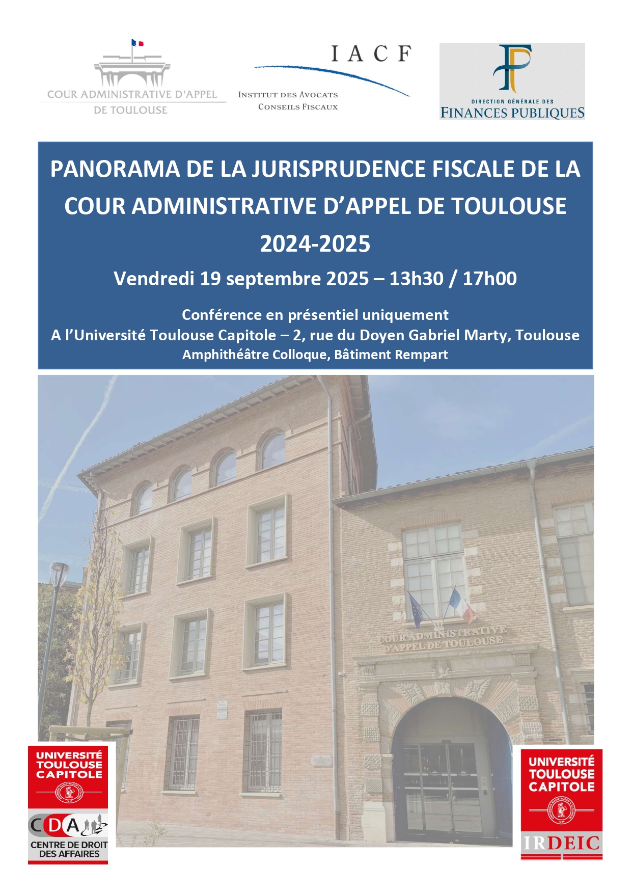 Conférence " Panorama de la jurisprudence fiscale de la Cour Administrative d'Appel de Toulouse 2025 " , co-organisée par le CDA et l'IRDEIC