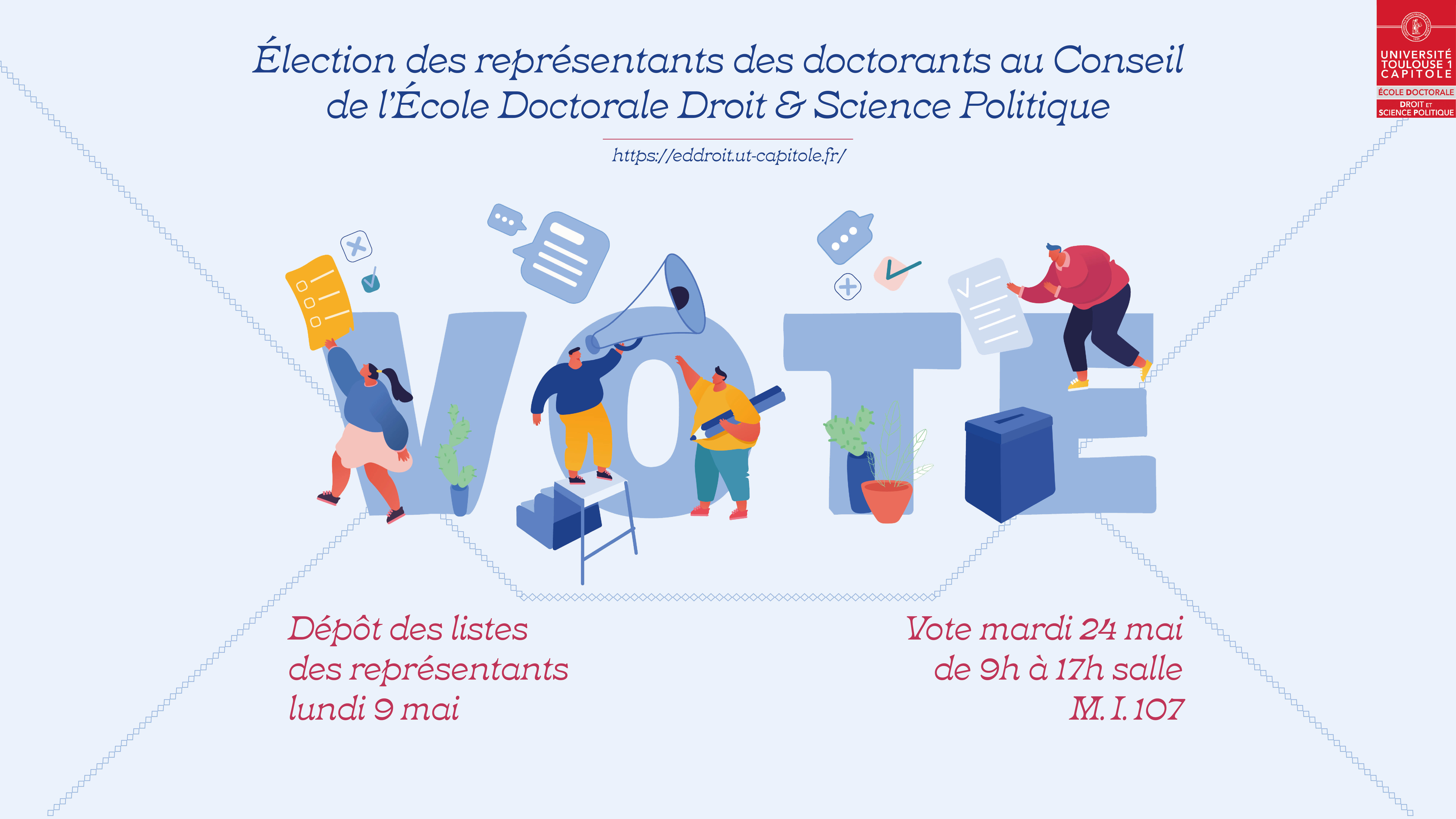 Le mardi 24 mai, de 09h à 17h en salle MI 107, auront lieu les élections des représentants des doctorants au sein du Conseil de l'École Doctorale Droit et Science Politique.