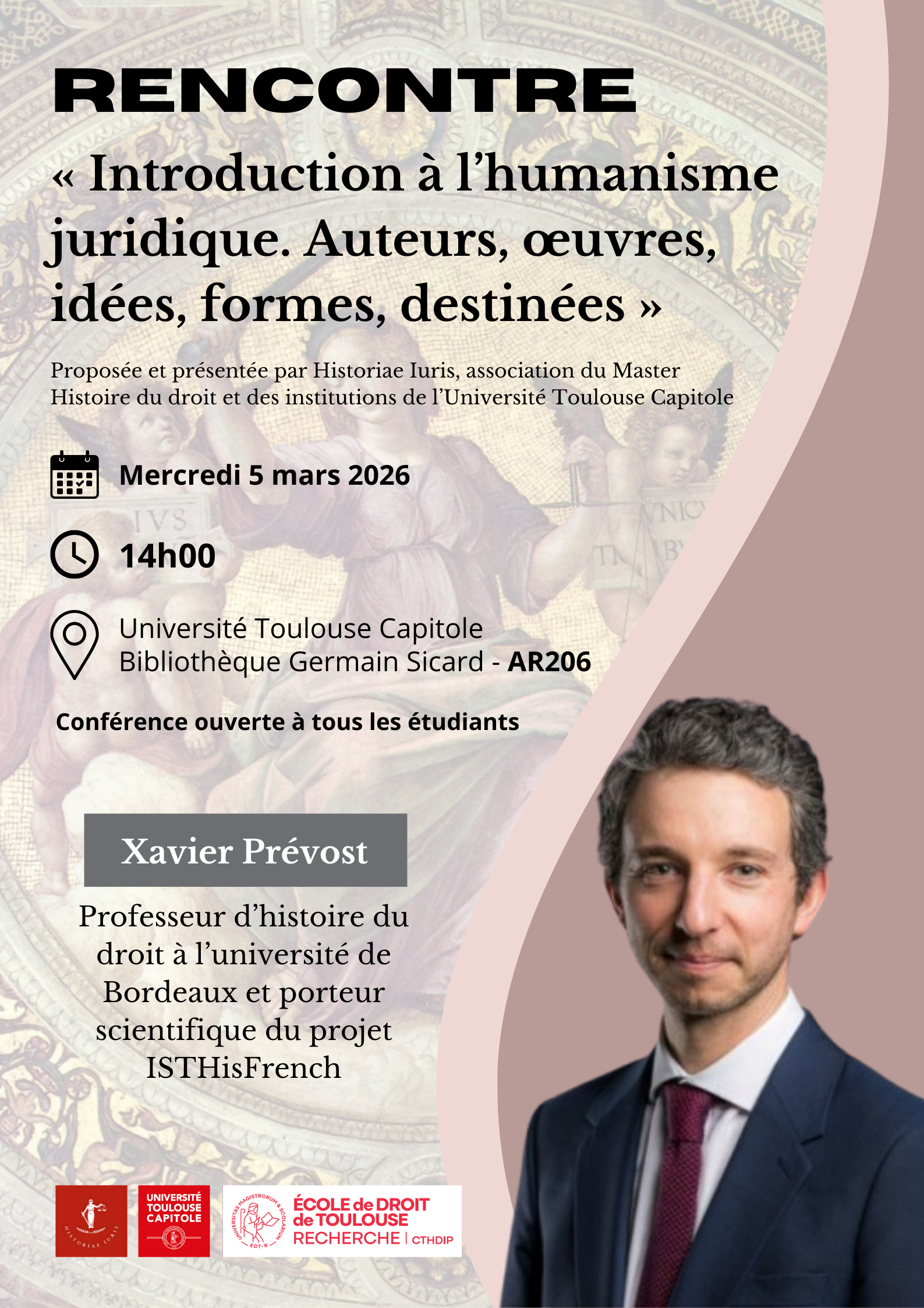 L'association Historiae Iuris et le Centre Toulousain d'Histoire du Droit et des Idées Politiques (CTHDIP) présentent une conférence donnée par le professeur Xavier Prévost, co-directeur de l'Introduction à l'humanisme juridique : Auteurs, œuvres, idées, formes, destinées. Il s'agira d'examiner en particulier la manière dont, dans l'Europe de la Renaissance, les humanistes investirent le domaine du droit et comment ce renouvellement philologique et encyclopédique transforma la science juridique et la connaissance de l'Antiquité. L’exposé articulera problématique, sources et méthodes, en insistant sur les continuités et ruptures entre culture savante et pratiques juridiques ainsi que sur les implications pour la formation doctrinale et l’enseignement du droit.
