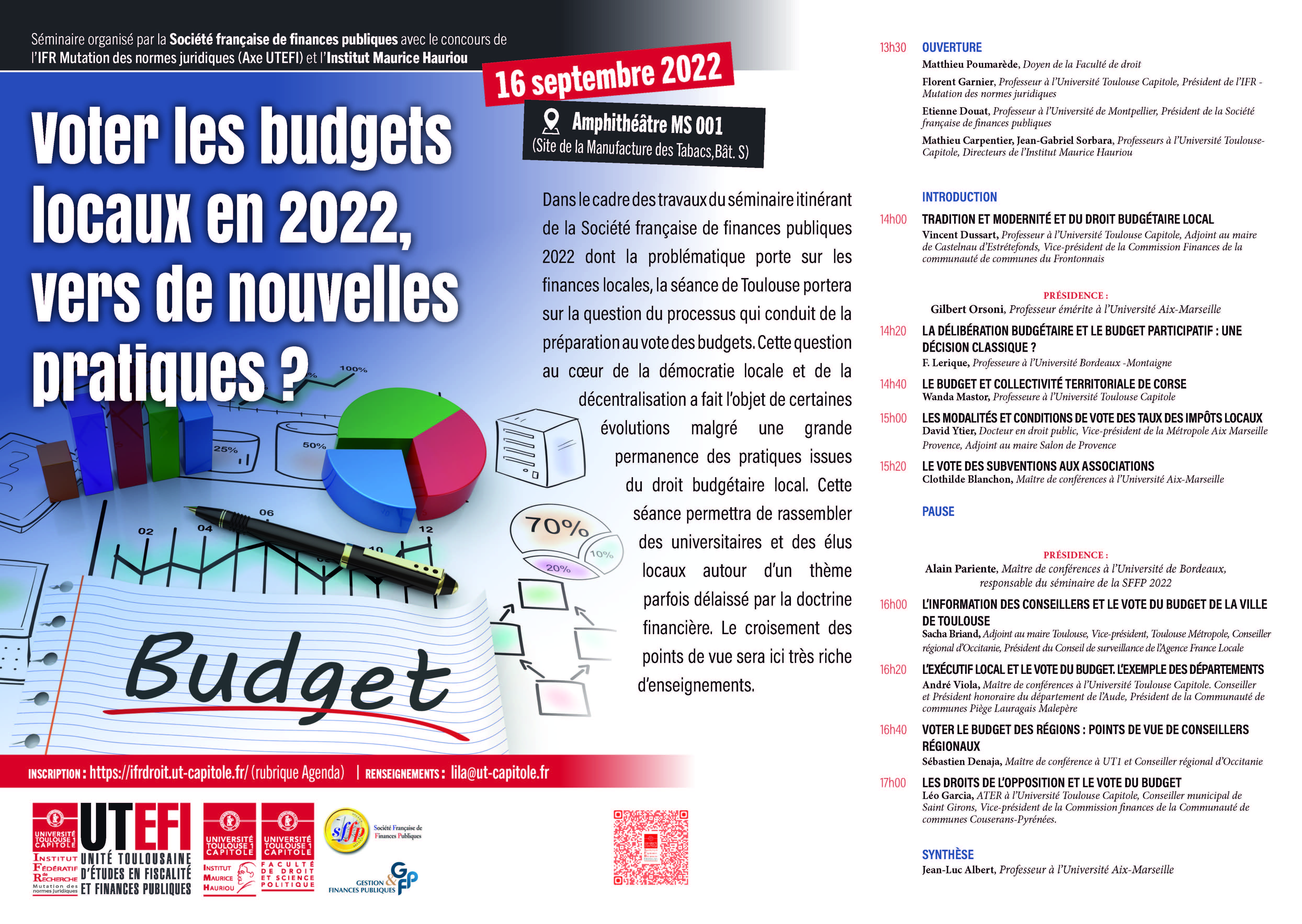 Dans le cadre des travaux du séminaire itinérant de la Société française de finances publiques 2022 dont la problématique porte sur les finances locales, la séance de Toulouse portera sur la question du processus qui conduit de la préparation au vote des budgets.
